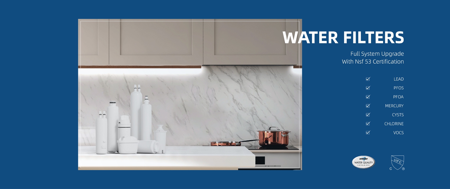Nuestros filtros de agua están certificados con estándares líderes en la industria, incluidos NSF 42, NSF 53, NSF 401, CE, FDA, EPA e ISO, asegurando la más alta calidad y seguridad para sus clientes.