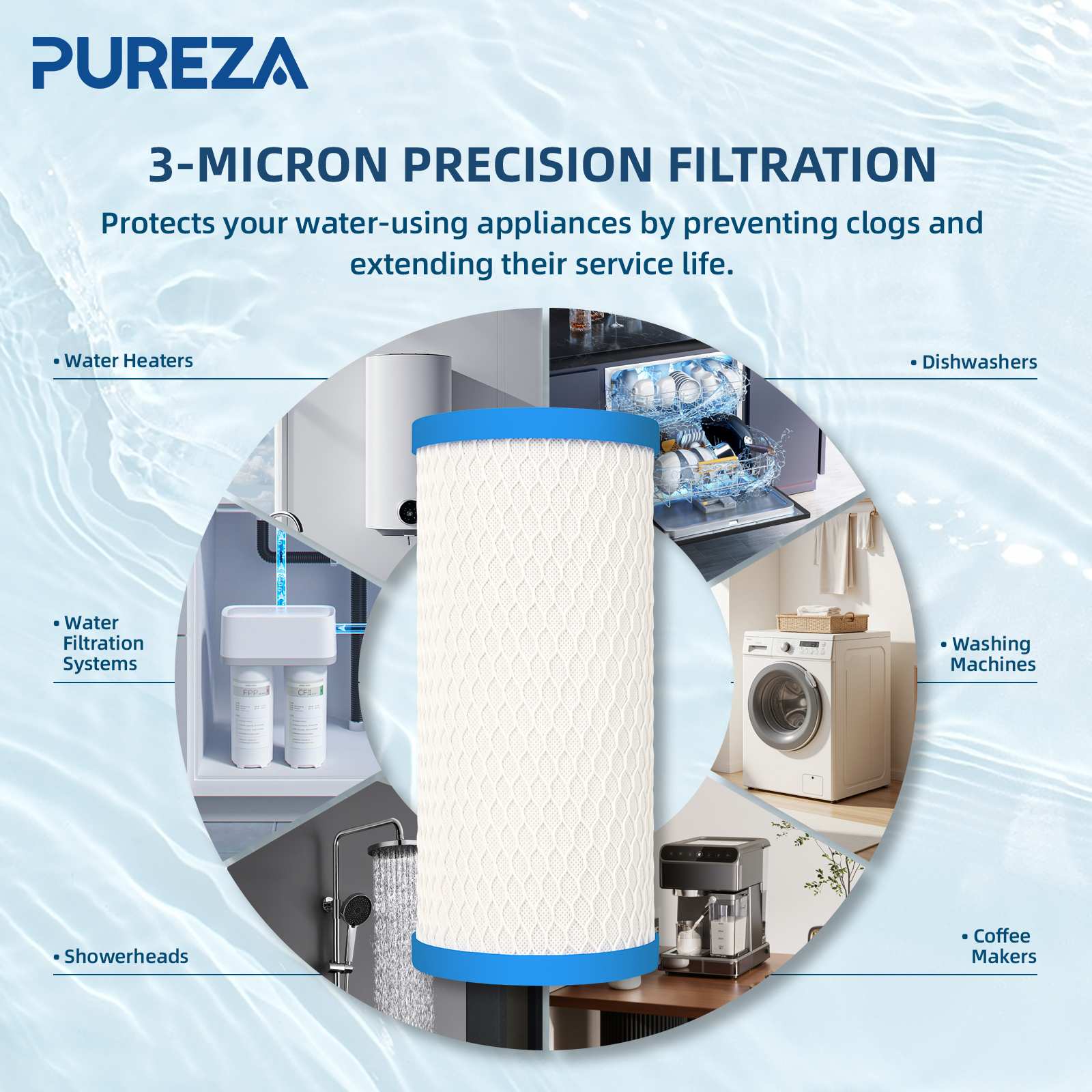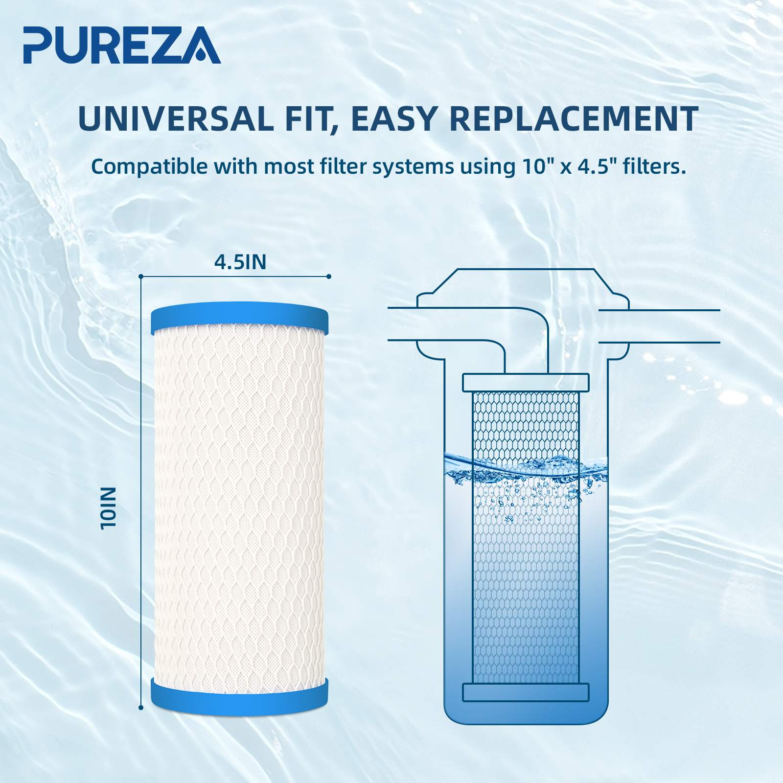 Diseñado como un bloque de carbón azul universal de 10 pulgadas, se adapta a la mayoría de los sistemas estándar para toda la casa y a los sistemas de filtración tradicionales bajo fregadero del mercado. Su fácil instalación y rápida sustitución lo convierten en la opción ideal tanto para uso doméstico como comercial.