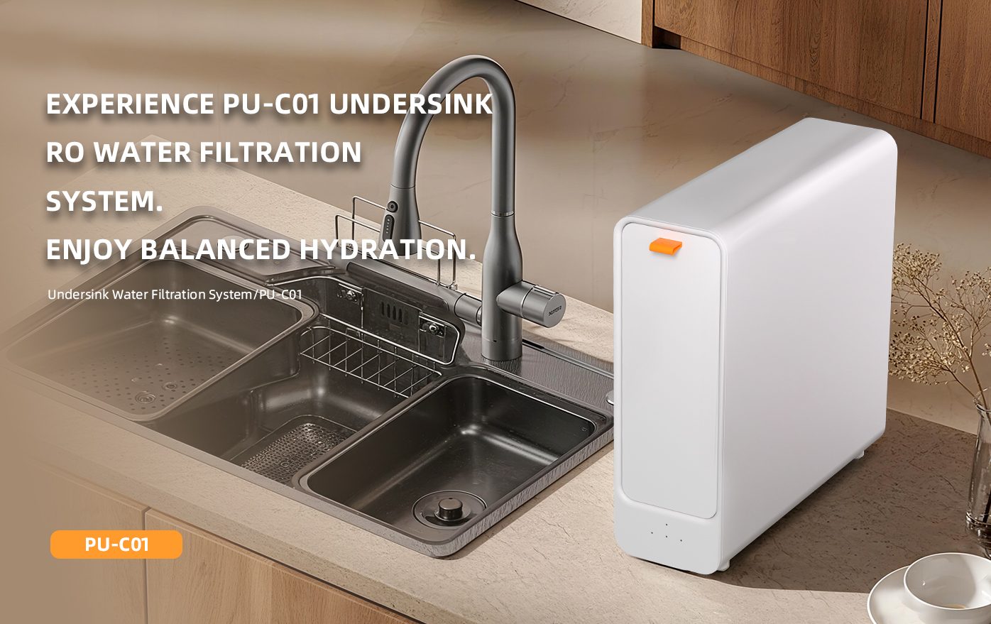 El agua purificada es limpia, fresca y equilibrada, ideal para beber, cocinar y para el uso diario. Sistema de filtración por ósmosis inversa (RO) debajo del fregadero PU-C01 Presenta un diseño compacto y eficiente que es fácil de mantener, pero que conserva un alto Caudal de 800 g Y con un cartucho filtrante de larga duración. Se integra perfectamente en su cocina y satisface plenamente las necesidades de agua de su hogar.