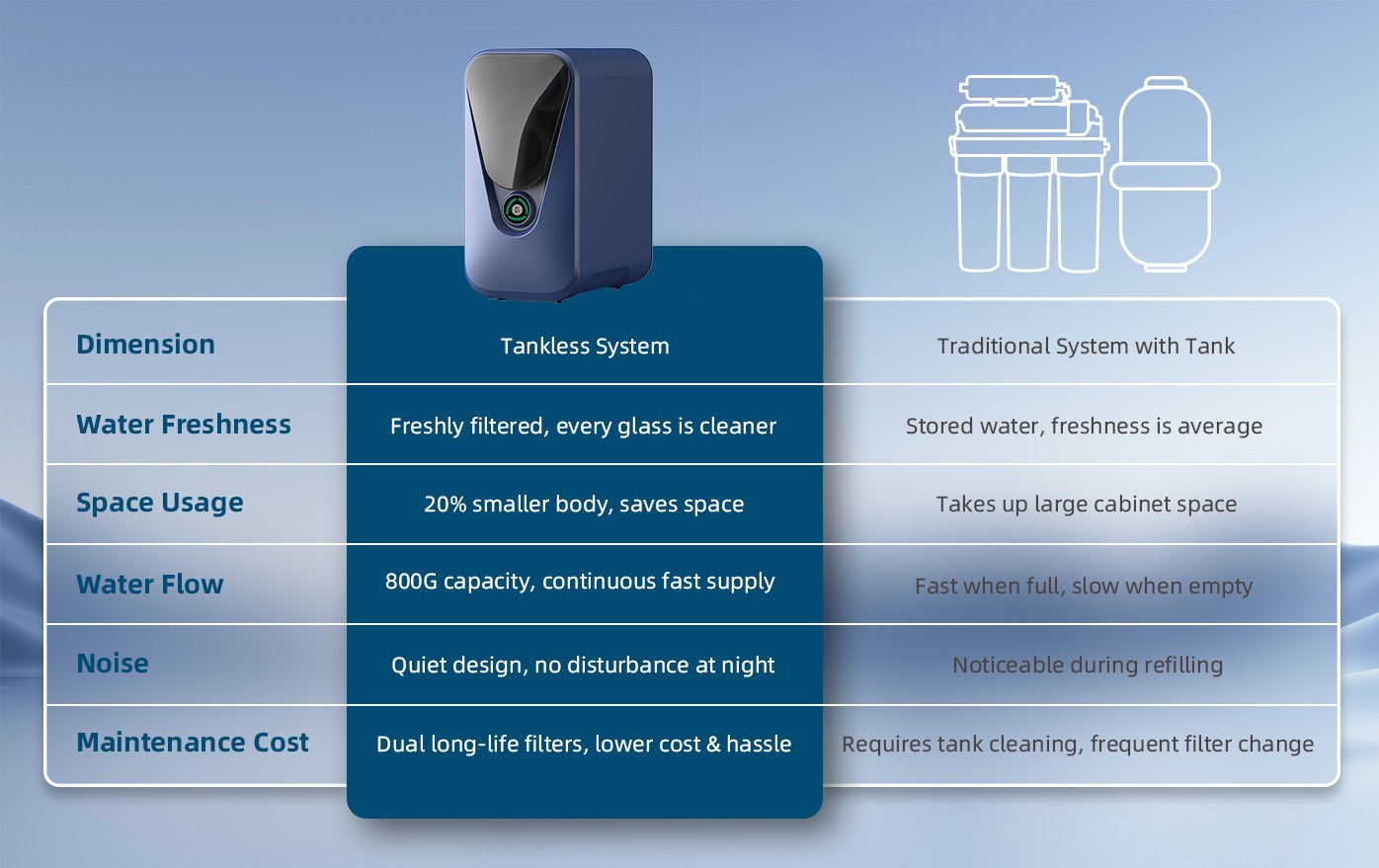 From the comparison, it’s clear that traditional systems with tank offer the advantage of lower upfront cost, while tankless RO systems better meet modern households’ needs for freshness, efficiency, space-saving, and convenience—with more obvious advantages overall.